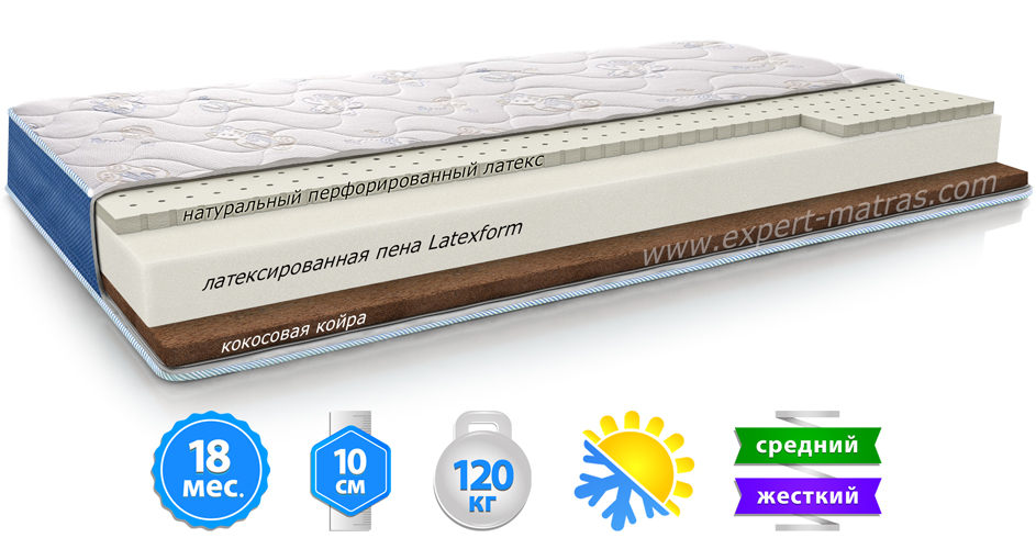 4. Latex (Латекс) - это переработанный сок каучукового дерева Гевеи. Латекс чрезвычайно эластичный и упругий, хорошо вентилируемый и гигиеничный материал. Долговечен, не гигроскопичен, не вызывает аллергии.