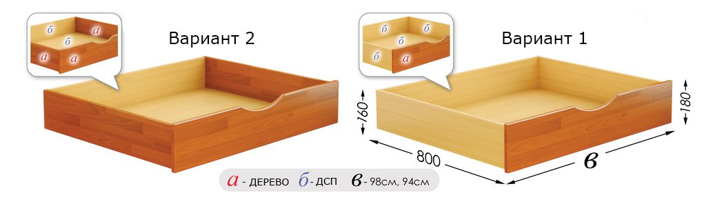 Кровать может комплектоваться вместительными ящиками. Высота такого ящика составляет 18см, длина – 94 или 98см (в зависимости от длины кровати). Ящик перемещается по полу с помощью роликов и к кровати не крепится.