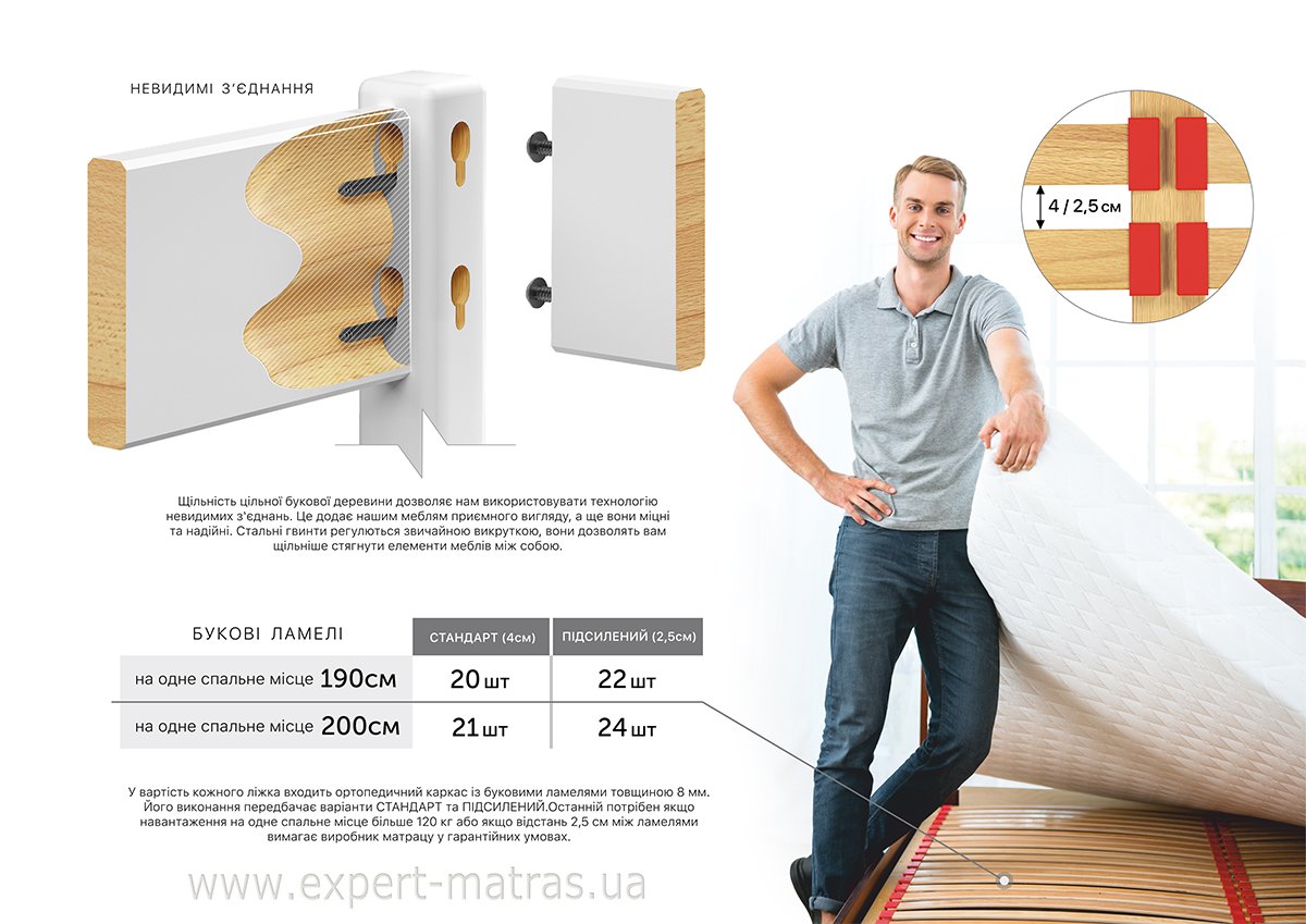 Кровать комплектуется гнутыми ламелями из буковой фанеры толщиной 8 мм. Обеспечивают дополнительный ортопедический эффект и комфорт. Стандартное расстояние между ламелями - 4 см (на одно спальное место длиной 190 см - 18 шт ламелей).