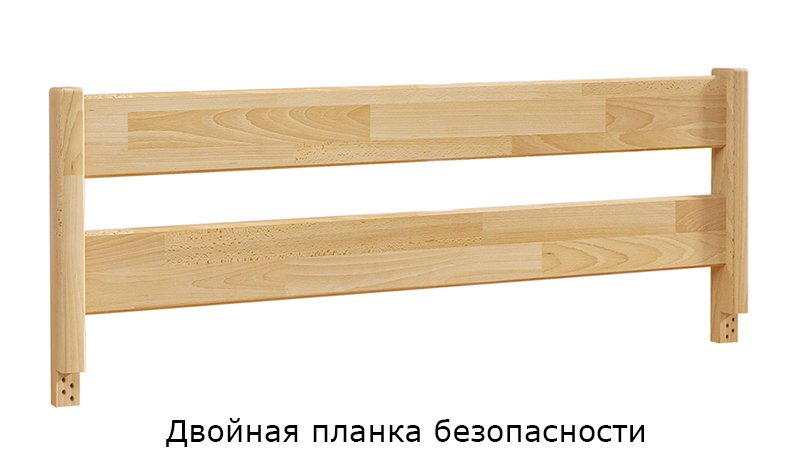 Кровать можно укомплектовать планкой безопасности, которая предназначена для защиты спящего человека (особенно, ребенка) от случайного падения с кровати. Она представляет из себя бортик, который очень легко крепится к стенке кровати с помощью специальных зажимов и увеличивает высоту стенки на 18см.
