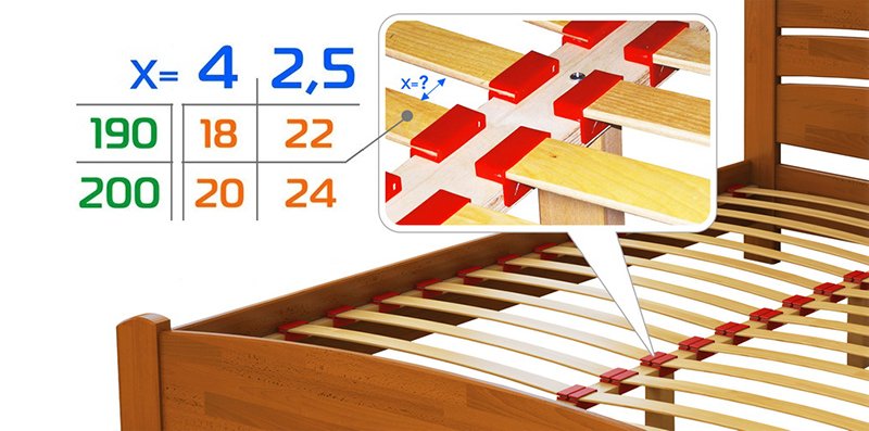 Количество ламелей на одно спальное место 22шт (длина спального места 190 см, расстояние между ламелями 2,5 см) |
