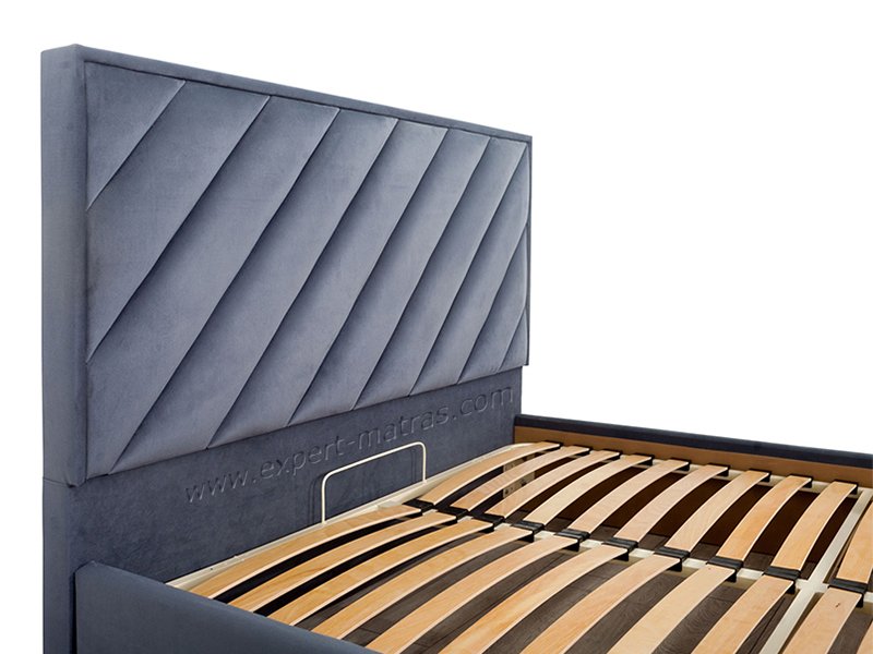Металлическая разборная рамка с ламелями (38 шт) + обитые широкие царги (7,5 см) + подъемный механизм с двумя импортными пневмопатронами + бельевой ящик глубиной 18,5 см со спан-бондом на дне + пластиковые опоры 5 мм