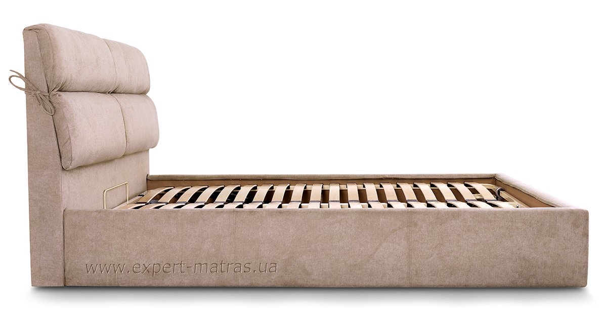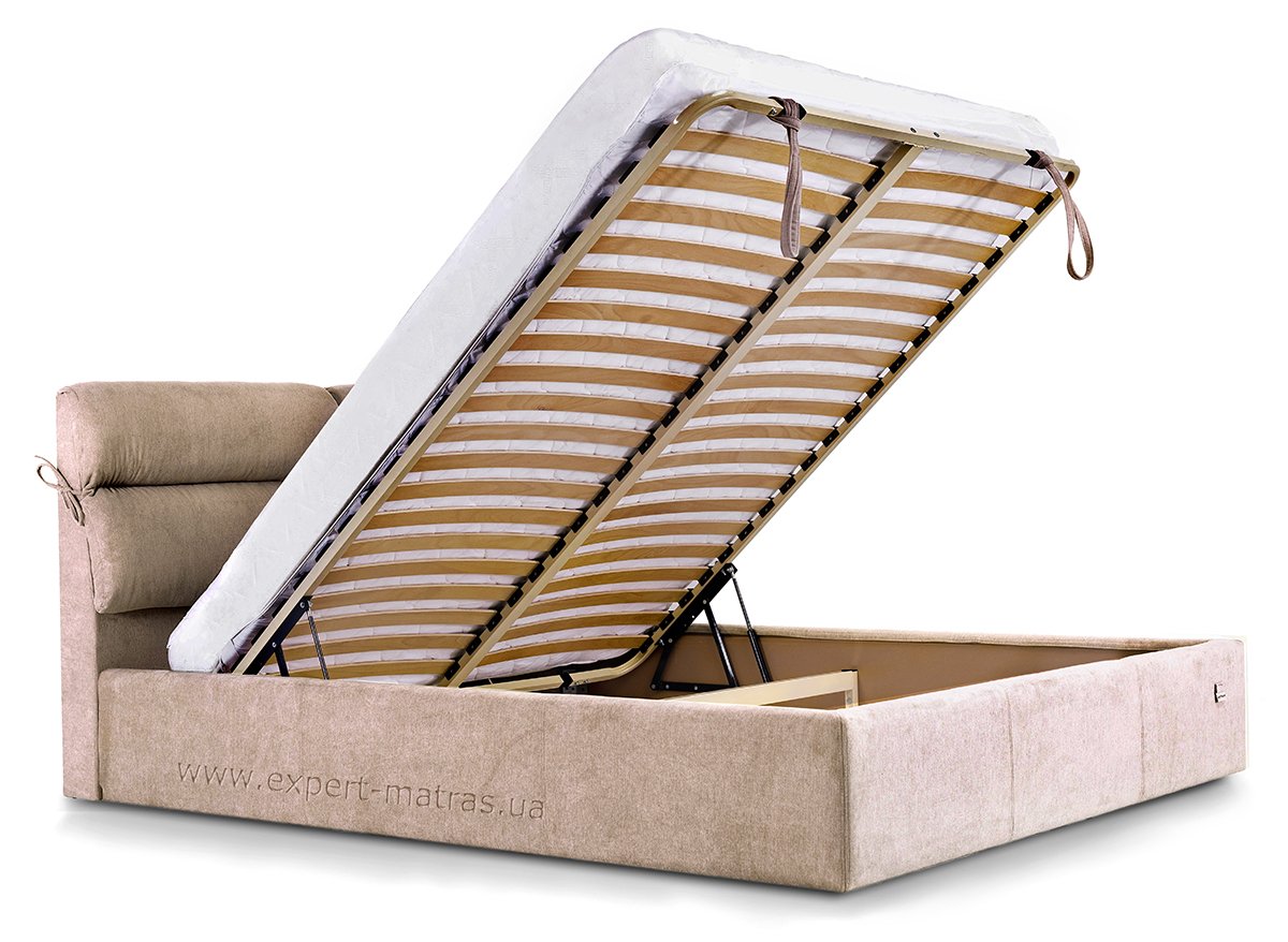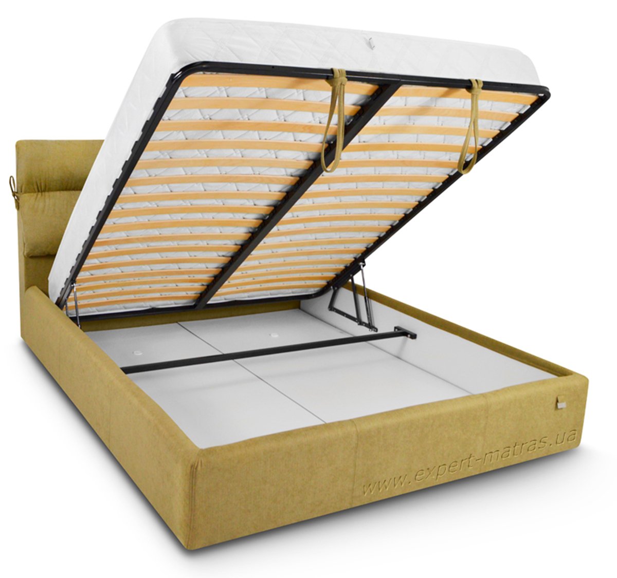 Металлическая цельносварная верхняя рамка с ламелями (38 шт) + дополнительная нижняя металлическая цельносварная рамка + широкие царги (6 см) со съемным цельным чехлом на липучках + подъемный механизм с двумя импортными пневмопатронами + бельевой ящик глубиной 17 см с ламинированным ХДФ на дне + металлические опоры 5 см