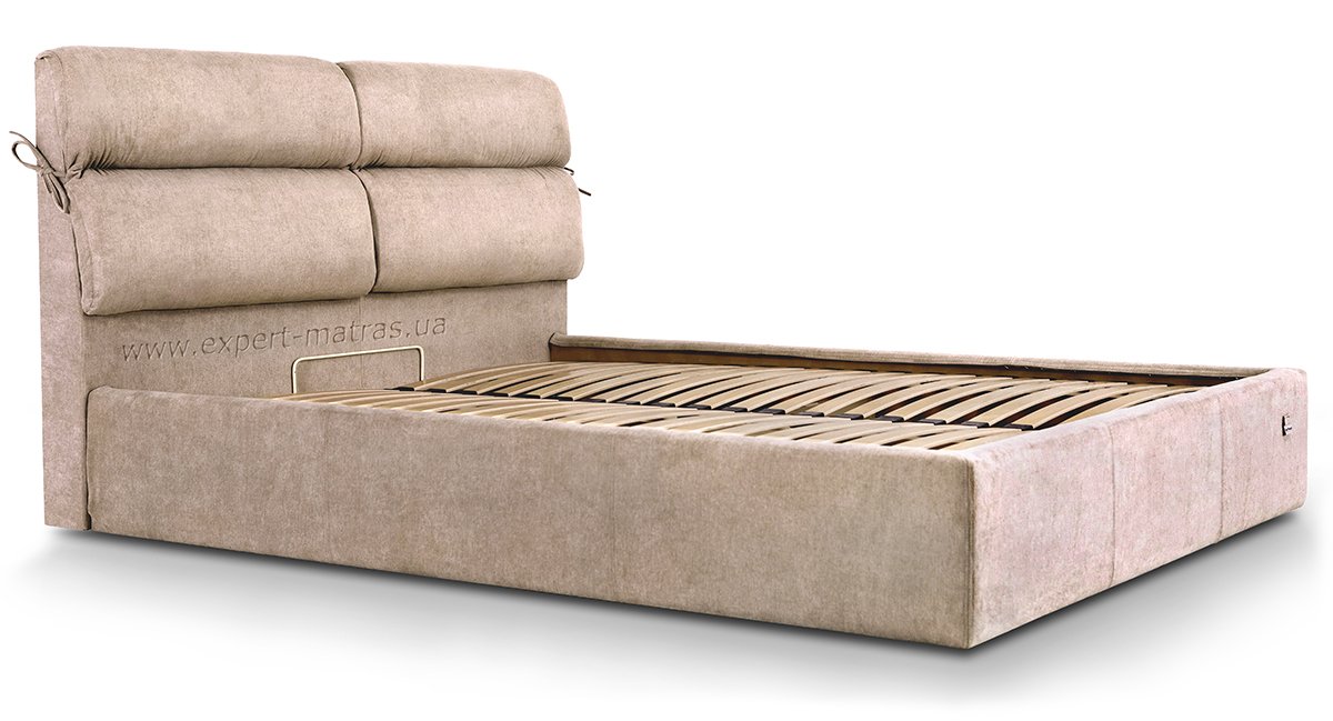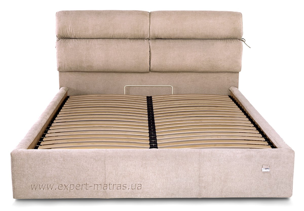 Металлическая цельносварная верхняя рамка с ламелями (38 шт) + дополнительная нижняя металлическая цельносварная рамка + широкие царги (6 см) со съемным цельным чехлом на липучках + подъемный механизм с двумя импортными пневмопатронами + бельевой ящик глубиной 17 см с ламинированным ХДФ на дне + деревянные ножки 10 см (в цвете бук / орех / венге)