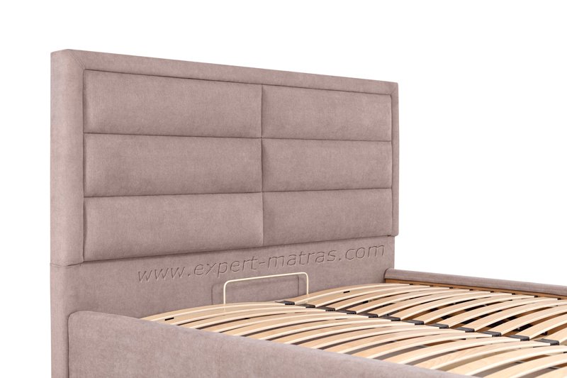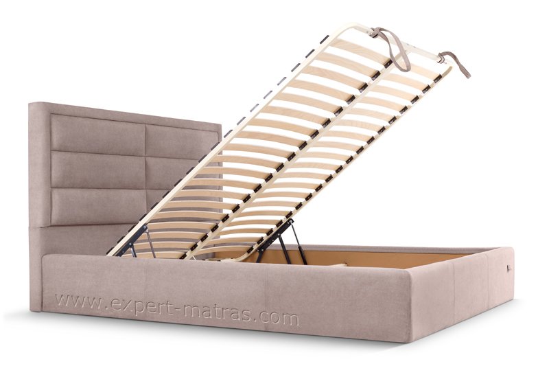 Металлическая разборная рамка с ламелями (38 шт) + обитые широкие царги (7,5 см) + подъемный механизм с двумя импортными пневмопатронами + бельевой ящик глубиной 18,5 см со спан-бондом на дне + пластиковые опоры 5 мм |