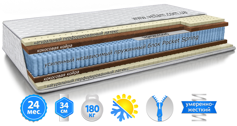 Блок независимых пружин, способный выдерживать большие нагрузки. Для создания усиленной пружины "SPS" (Strengthened Pocket Spring) применяется проволока большего диаметра, Ø - 1,9мм. (Обычный диаметр проволоки Ø - 1,8мм.). По периметру укрепленный двумя ребрами из стальной проволоки. Каждая пружина помещена в отдельный мешочек и прогибается независимо от остальных. Такая структура позволяет равномерно распределять давление на туловище человека и точечно поддерживать позвоночник в анатомически правильном положении. Это создает ярко выраженный ортопедический эффект и гарантирует здоровый и комфортный сон.