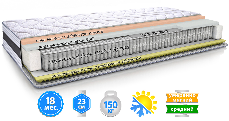 3. Memory Foam (Пена памяти) - революционный материал с замедленной эластичностью. Это экологически чистый, гипоаллергенный материал способный запоминать форму тела. Пена памяти подстраивается под силуэт лежащего на матрасе человека, и «запомнив» его, не оказывает на тело ответного давления.