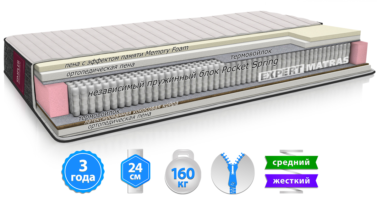 Это независимый пружинный блок, который состоит из эластичных металлических пружин бочкообразной формы, зашитых в отдельные карманы из высокопрочного материала и скрепленных между собой в центре. Такая конструкция позволяет каждой пружине точечно реагировать на нагрузку, без влияния на соседние пружины и максимально точно повторять фигуру отдыхающего, а так же гарантирует удобное положение и правильную поддержку во время сна.