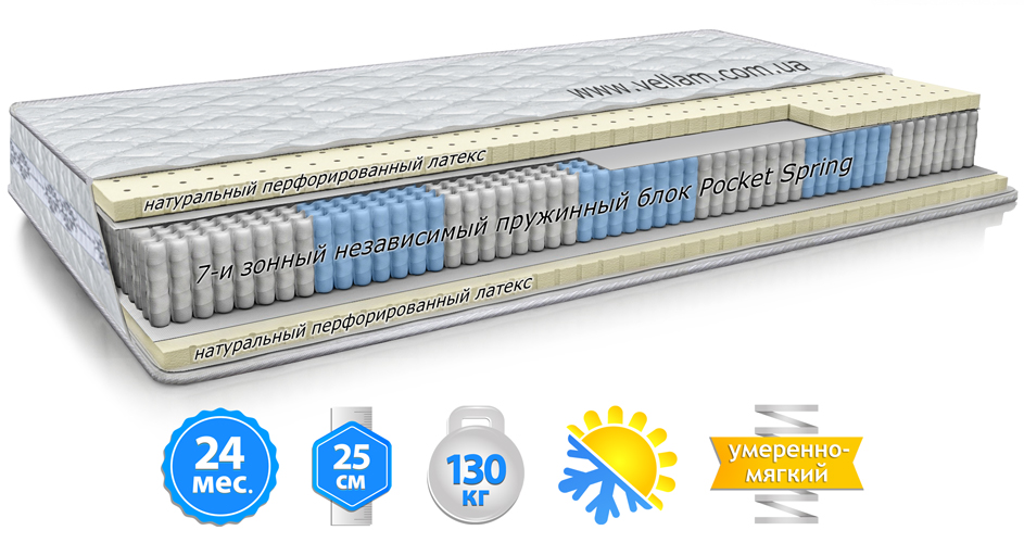 Натуральный вспененный материал, получаемый из переработанного сока дерева Гевеи. Латекс чрезвычайно эластичный, упругий и гигиеничный материал, который имеет пористую структуру. Латексные плиты в основном выполняются с вертикальными отверстиями, которые позволяют отводить влагу и вентилировать спальное место. Главное преимущество натурального латекса – его структура со временем практически не дает усадки, а значит долгое время будет дарить комфорт нового изделия.