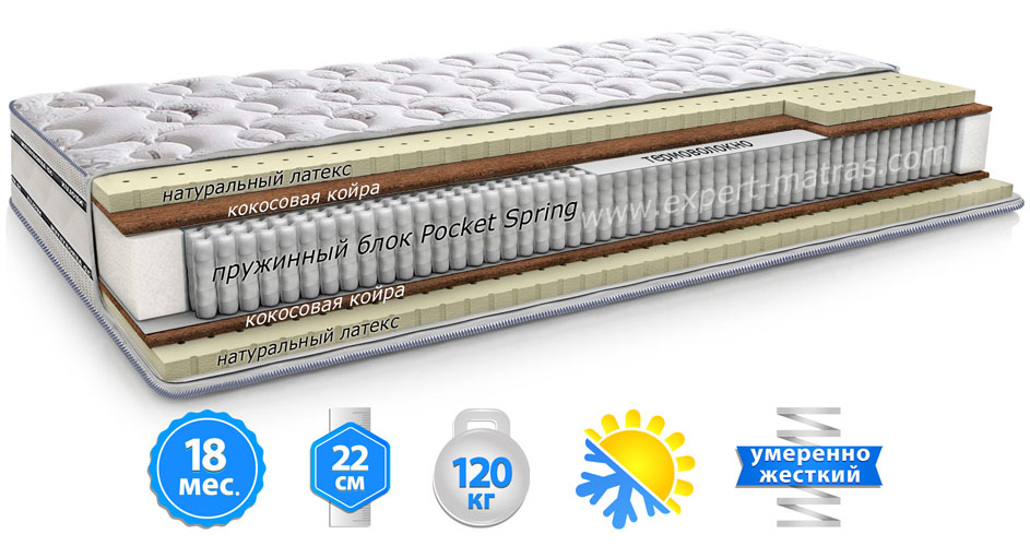 Еврокаркас это борт из пенополиуретана по периметру матраса. Необходим для поддержания формы матраса при длительном использовании, увеличивает жесткость и износостойкость краев матраса, которые обычно выходят из строя первыми, особенно если на краях матраса часто сидят. Усиленный еврокаркас позволяет сидеть на краях матраса, если же в матрасе стандартный еврокаркас или он отсутствует - это не рекомендуется. Так же еврокаркас защищает наполнители матраса от пыли и влаги и снижает шум пружин при эксплуатации.