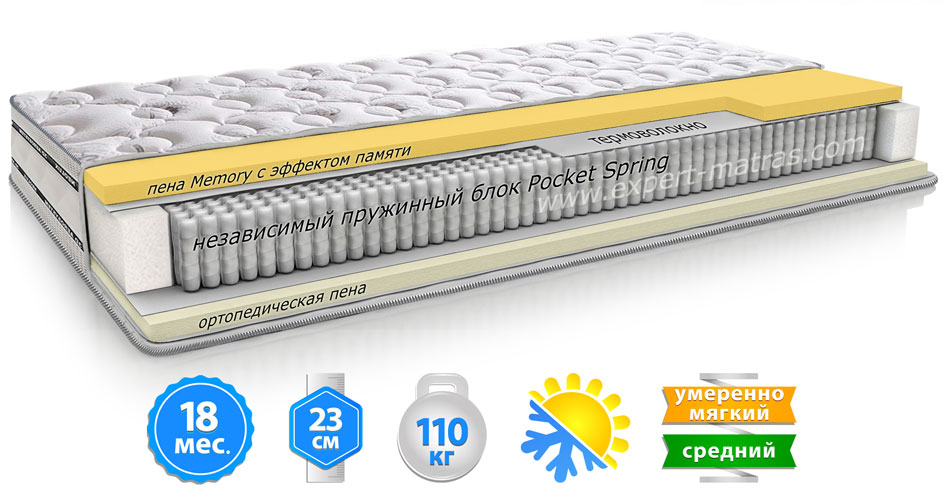 4. Memory Foam (Пена памяти) - революционный материал с замедленной эластичностью. Это экологически чистый, гипоаллергенный материал способный запоминать форму тела. Пена памяти подстраивается под силуэт лежащего на матрасе человека, и «запомнив» его, не оказывает на тело ответного давления.