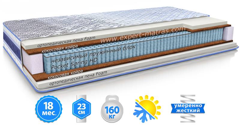 Блок независимых пружин, способный выдерживать большие нагрузки. Отличается большей толщиной проволоки (чем у стандартного пружинного блока данного типа) из которой производятся пружины и по периметру укрепленный двумя ребрами из стальной проволоки. Каждая пружина помещена в отдельный мешочек и прогибается независимо от остальных. Такая структура позволяет равномерно распределять давление на туловище человека и точечно поддерживать позвоночник в анатомически правильном положении. Это создает ярко выраженный ортопедический эффект и гарантирует здоровый и комфортный сон.