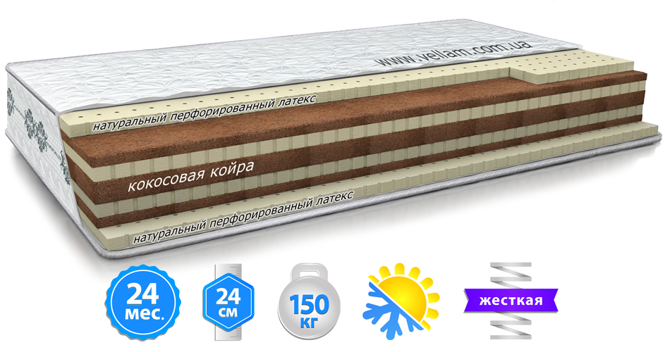 Является одним из лучших природных настилов для матраса. Этот материал производится путем скрепления волокон кокосового ореха натуральным латексным составом. Благодаря своей волокнистой структуре обладает отличной природной вентилируемостью и прекрасным теплообменом. Кокосовая койра абсолютно безопасна для здоровья, экологически чиста и гипоаллергенна. Главная задача кокосовой койры в составе матраса - повышение ортопедического эффекта путем создания дополнительной поверхностной жесткости, а также продление срока службы матраса за счет лучшего распределения давления между соседними слоями других настилов.