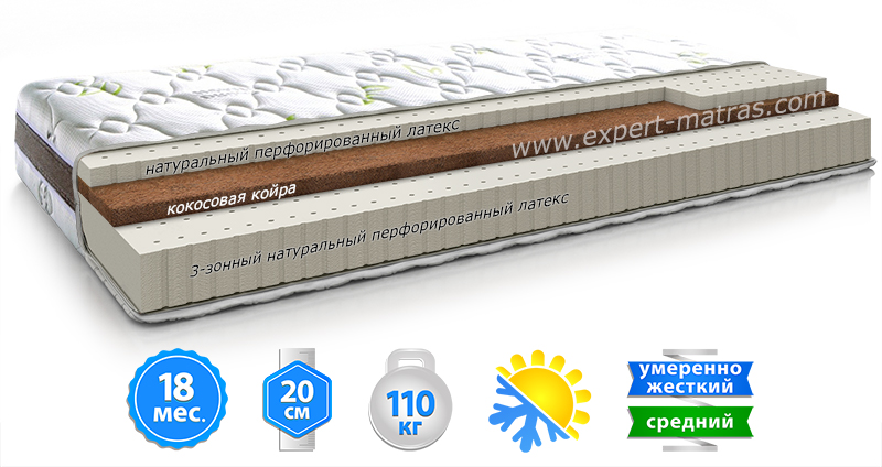 6. Кокосовая койра - плиты из волокон коричневой рубашки кокосового ореха, скрепленных напылением латексных растворов. Основные достоинства экологически чистого природного материала: бактерицидные свойства, не подвержена гниению, не вызывает аллергических реакций. Плотность плит койры - 80-90 кг/м3. Пропитанная латексом структура создает полужесткую, упругую основу - важнейший аспект долговечности матраца.