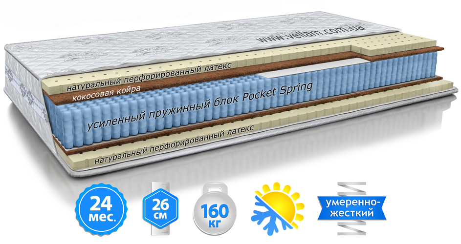 Блок независимых пружин, способный выдерживать большие нагрузки. Для создания усиленной пружины "SPS" (Strengthened Pocket Spring) применяется проволока большего диаметра, Ø - 1,9мм. (Обычный диаметр проволоки Ø - 1,8мм.). По периметру укрепленный двумя ребрами из стальной проволоки. Каждая пружина помещена в отдельный мешочек и прогибается независимо от остальных. Такая структура позволяет равномерно распределять давление на туловище человека и точечно поддерживать позвоночник в анатомически правильном положении. Это создает ярко выраженный ортопедический эффект и гарантирует здоровый и комфортный сон.