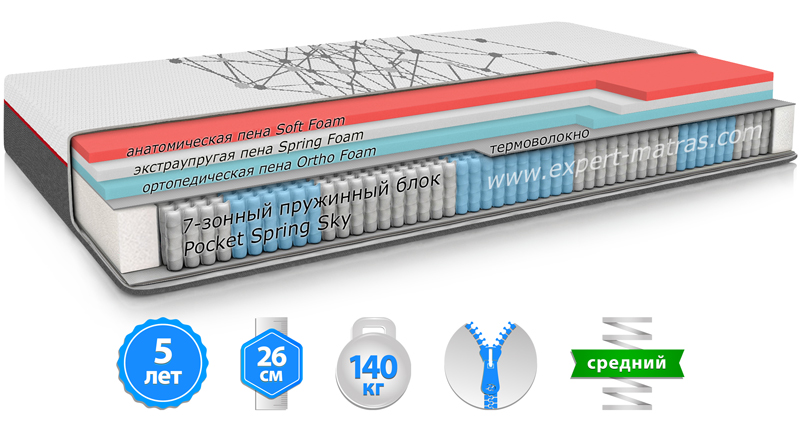 Блок независимых пружин с увеличенным количеством витков. Высота блока 18 см, а рабочая амплитуда пружины в 2 раза выше, чем в классическом Pocket Spring. Матрас еще лучше подстраивается под контуры вашего тела и усиливает анатомический эффект. Здесь реализовано 7 зон жесткости, которые обеспечат максимально естественное положение позвоночника во время сна. Блок Pocket Spring Sky 7 делает матрас долговечным за счет того, что пружины выдерживают более высокое давление.