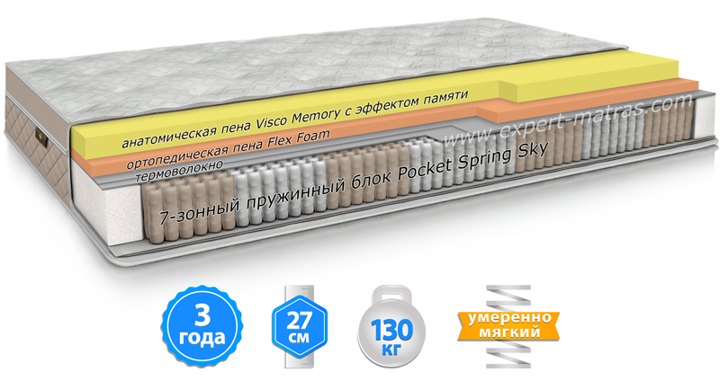 Блок независимых пружин с увеличенным количеством витков. Высота блока 18 см, а рабочая амплитуда пружины в 2 раза выше, чем в классическом Pocket Spring. Матрас еще лучше подстраивается под контуры вашего тела и усиливает анатомический эффект. Здесь реализовано 7 зон жесткости, которые обеспечат максимально естественное положение позвоночника во время сна. Блок Pocket Spring Sky 7 делает матрас долговечным за счет того, что пружины выдерживают более высокое давление.