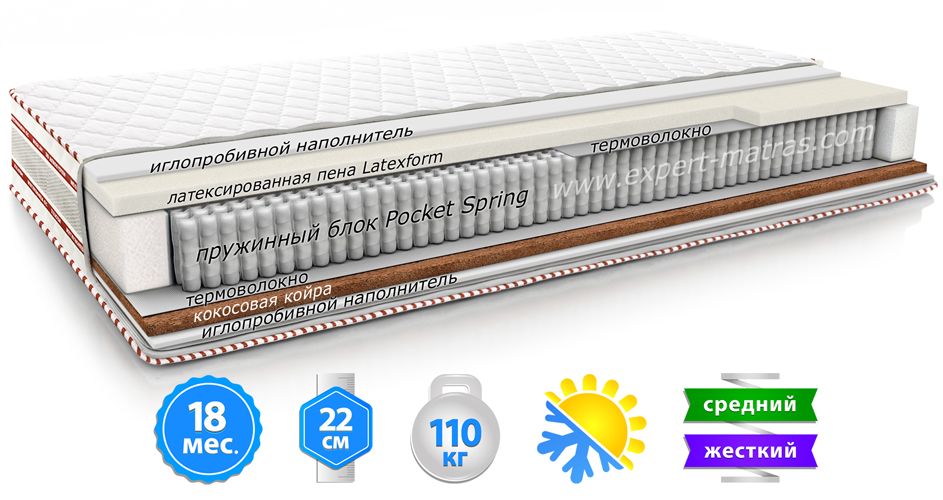 7. Кокосовая койра - плиты из волокон коричневой рубашки кокосового ореха, скрепленных напылением латексных растворов. Основные достоинства экологически чистого природного материала: бактерицидные свойства, не подвержена гниению, не вызывает аллергических реакций. Плотность плит койры - 80-90 кг/м3. Пропитанная латексом структура создает полужесткую, упругую основу - важнейший аспект долговечности матраца.