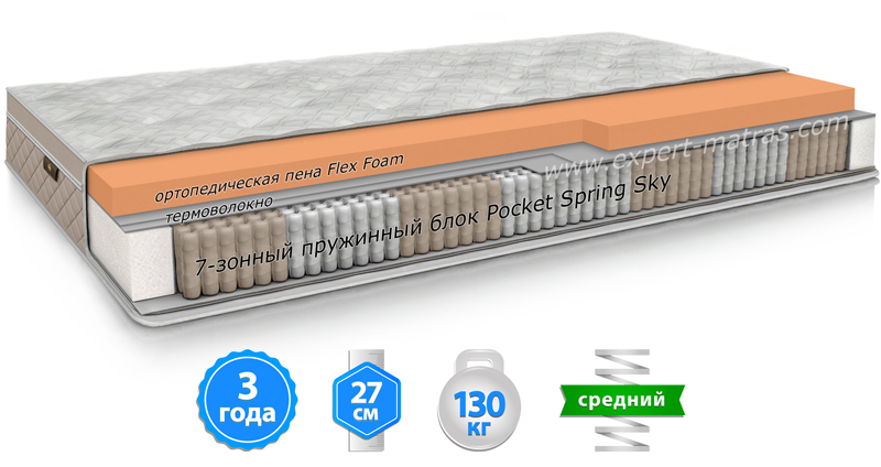 Блок независимых пружин с увеличенным количеством витков. Высота блока 18 см, а рабочая амплитуда пружины в 2 раза выше, чем в классическом Pocket Spring. Матрас еще лучше подстраивается под контуры вашего тела и усиливает анатомический эффект. Здесь реализовано 7 зон жесткости, которые обеспечат максимально естественное положение позвоночника во время сна. Блок Pocket Spring Sky 7 делает матрас долговечным за счет того, что пружины выдерживают более высокое давление.