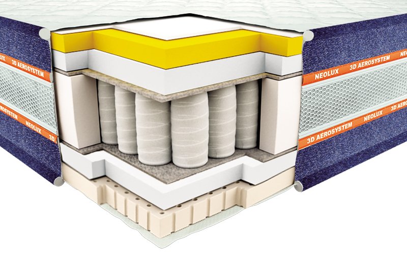 8. 3D Aerosystem - уникальная система микроклимата. Особенностью конструкции является трехмерная аэролента, интегрированная в борт матраса по всему периметру. Система позволяет воздуху и влаге, проходя сквозь настилочные слои матраса, беспрепятственно выходить из него во всех направлениях.