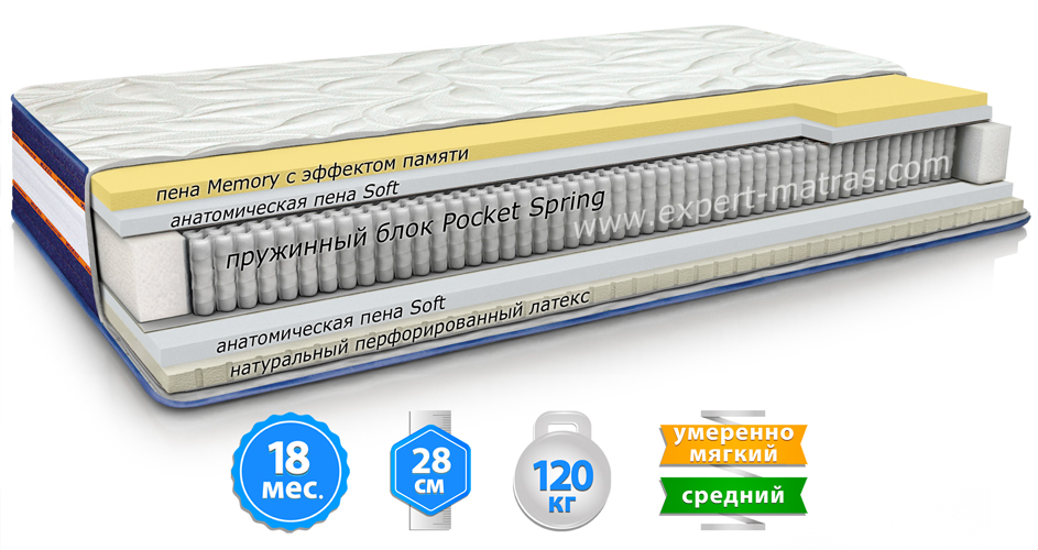 2. Memory Foam (Пена памяти) - революционный материал с замедленной эластичностью. Это экологически чистый, гипоаллергенный материал способный запоминать форму тела. Пена памяти подстраивается под силуэт лежащего на матрасе человека, и «запомнив» его, не оказывает на тело ответного давления.