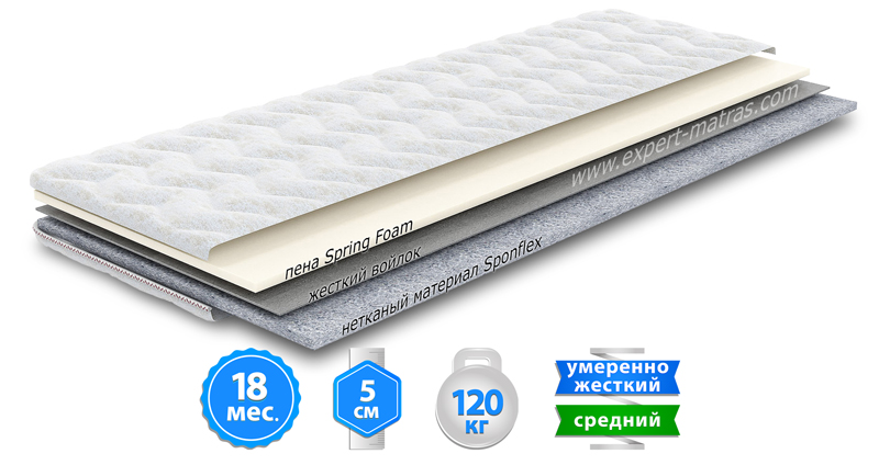 Натуральный экологически чистый нетканый материал. В его состав входят натуральные и регенерированные хлопковые, джутовые, льняные волокна, которые соединяются давлением и температурой в слой толщиной 2 см. Такой состав хорошо проводит воздух, а также обладает высокой способностью впитывать и выводить влагу. Спонфлекс делает спальное место еще теплее и уютнее. Оптимальное сочетание высокой плотности, эластичности и упругости подарит полноценный комфорт и крепкий сон.