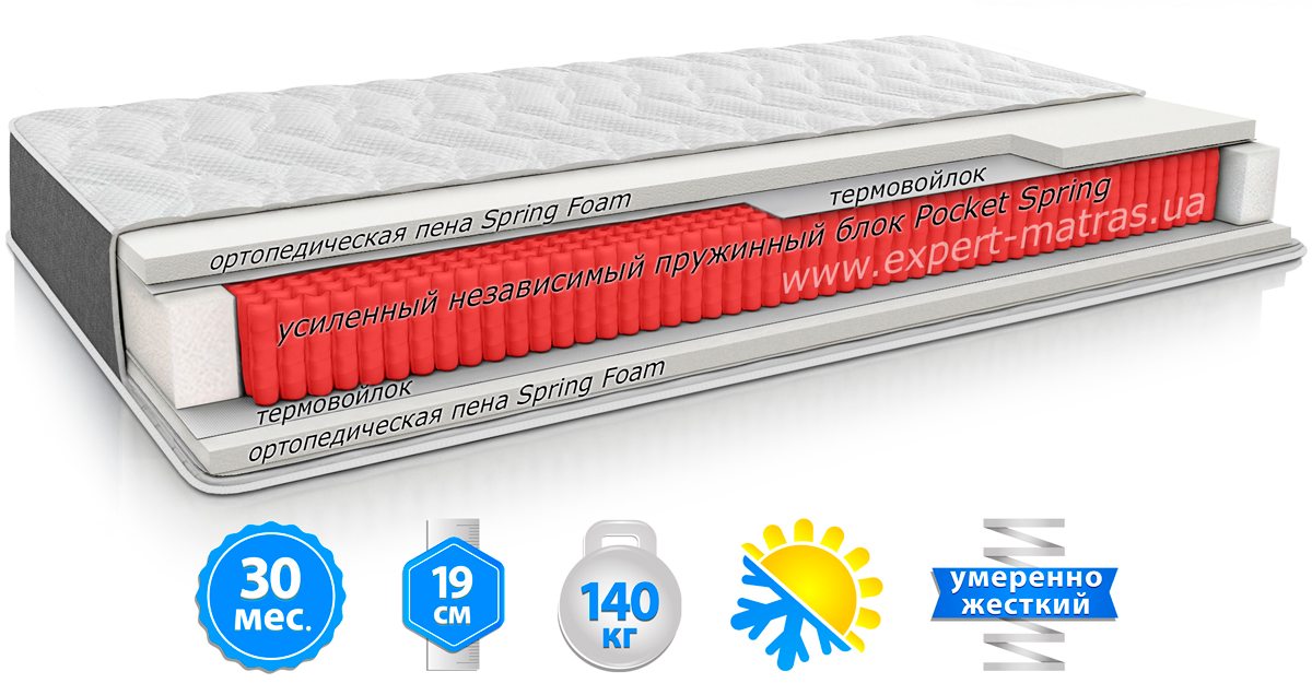 Блок независимых пружин, способный выдерживать большие нагрузки. Отличается большей толщиной проволоки (чем у стандартного пружинного блока данного типа) из которой производятся пружины и по периметру укрепленный двумя ребрами из стальной проволоки. Каждая пружина помещена в отдельный мешочек и прогибается независимо от остальных. Такая структура позволяет равномерно распределять давление на туловище человека и точечно поддерживать позвоночник в анатомически правильном положении. Это создает ярко выраженный ортопедический эффект и гарантирует здоровый и комфортный сон.
